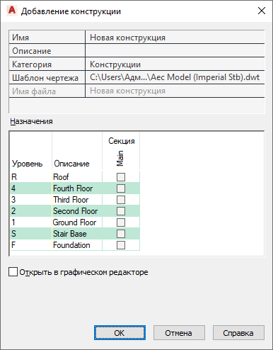 Прим.: Следует установить флажок только для одного уровня и для одной секции. Выбор нескольких уровней и секций приводит к созданию распределенных конструкций.