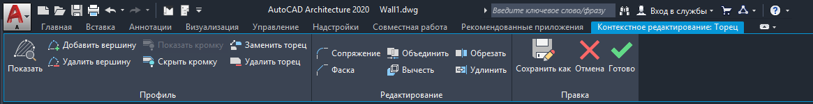 Редактирование по месту представляет собой особый режим редактирования, при котором компоненты объекта на основе полилиний или профилей могут редактироваться прямо на экране при ограничении других возможностей редактирования на чертеже. Например, в режиме редактирования по месту можно изменить торец стены, но нельзя сохранить и закрыть чертеж. После выхода из режима контекстного редактирования предоставляется выбор: отказаться от изменений, заменить существующее определение компонента или сохранить изменения в качестве нового определения.