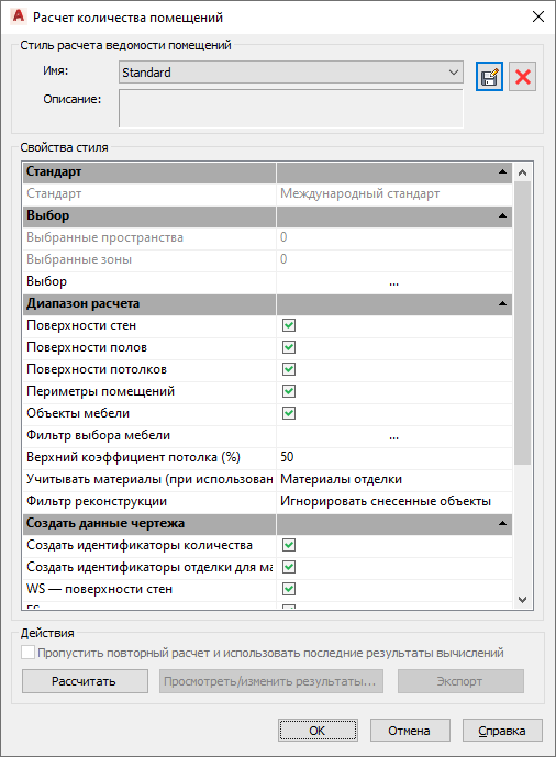 Для расчета количественных характеристик помещений необходимо указать диапазон расчета на основе текущего стандарта вычислений. В чертеже можно сохранить несколько разных стилей расчета с разными параметрами. Убедитесь, что в параметрах расчета задан правильный стандарт вычислений.