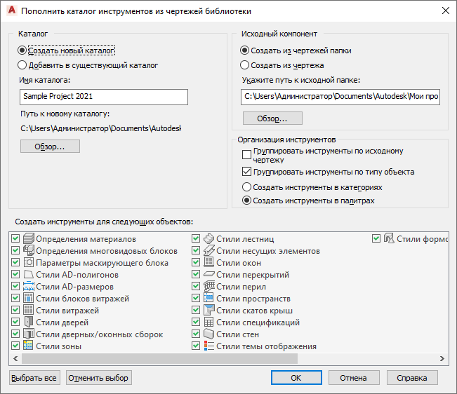 Прим.: Если помечены оба флажка, то группировка инструментов в каталоге производится сначала по чертежам, а затем по типам объектов, с генерированием категорий из чертежей, а палитр - из типов объектов. Такой вариант используется, поскольку палитры не могут быть вложенными. В данном случае переключатели для категорий и палитр отключены, включен переключатель "Создать инструменты по палитрам".