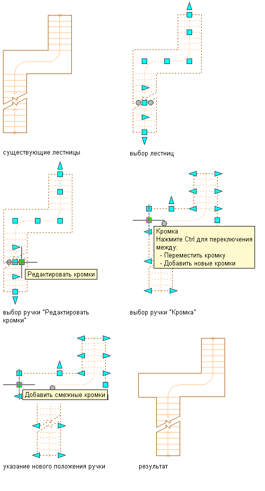 Эта процедура используется для изменения углов и положения сторон площадки П-образной и многомаршевой лестниц. Каждую сторону площадки можно сузить или переместить по отдельности, пользуясь указателями ручек.