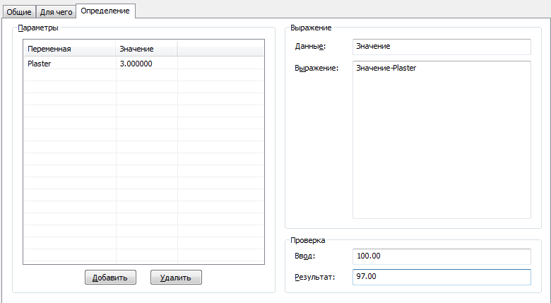 . Переменная состоит из имени переменной и ее величины. Например, для того, чтобы вычесть 3% штукатурки, нажмите "Добавить", введите "Учет_штукатурки" в поле "Переменная" и 0,97 - в поле "Значение".