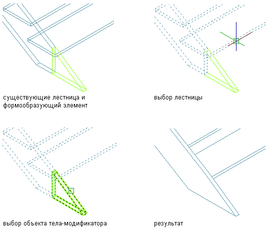 На следующем рисунке показано, как использовать формообразующий элемент в качестве тела-модификатора для его добавления к компоненту несущей конструкции лестницы.