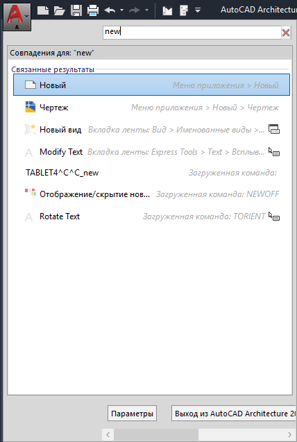 В меню приложения можно осуществлять поиск команды, а затем выбирать ее из списка соответствия. Результаты формируются на основе поиска в следующих местах: