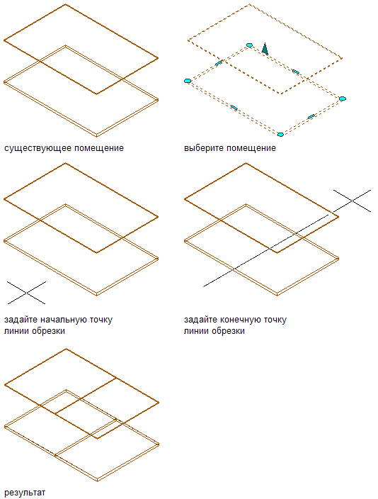 Эта процедура используется для разделения на две (или более) части линий, AD-полигонов, выступов формообразующих элементов, пространств или блоков, содержащих любой из этих объектов. Число частей определяется построенной разделяющей линией. Далее отдельно выбираются части на любой из сторон линии. Если объект с замкнутым контуром делится на две части с помощью этой опции, то обе части воссоздаются как замкнутые. Если открытая полилиния в зигзагообразном шаблоне делится по высоте, то создаются многочисленные выбираемые объекты.