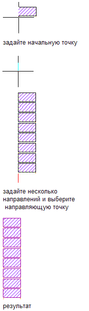 Эта процедура используется для вставки компонентов деталей, которые необходимо изобразить многократно в виде линейного массива, например, кирпичей. В этом примере свойству "Вид" инструмента вставки кирпичей присвоено значение "В разрезе". Если "Вид" установлено на "План", на экран выводятся те же самые подсказки. Если этому параметру присвоено значение "Фасад", применяются подсказки, описанные в разделе "Вставка компонентов штемпеля". Если этому параметру присвоено значение "Фасад (по образцу)", применяются подсказки, описанные в разделе "Вставка компонентов обратной засыпки".