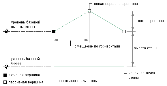 Данная процедура используется для того, чтобы добавить фронтон к линии крыши стены. Можно также добавить фронтон в таблицу "Линия крыши/Подошва" в палитре свойств.