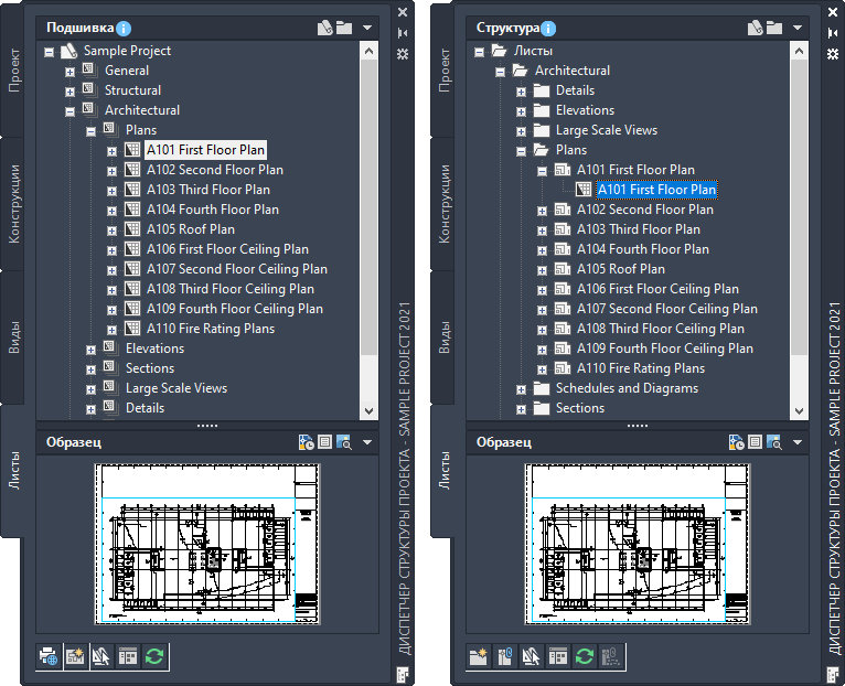 Листы систематизированы 2 разными способами. На вкладке "Структура" чертежи с листами размещаются в папки категорий. При создании листов или видов листа внутри чертежа с листами они размещаются на главном чертеже с листами.