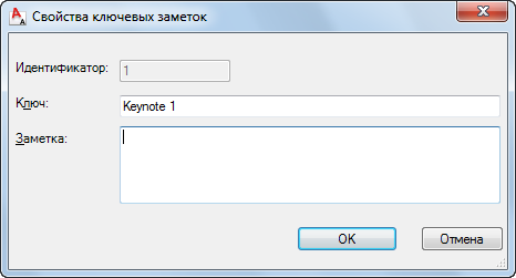 Открывается диалоговое окно "Свойства ключевых заметок", где в поле идентификатора "только считывание" отображается идентификатор базы данных для редактируемых пользователем ключевых заметок.