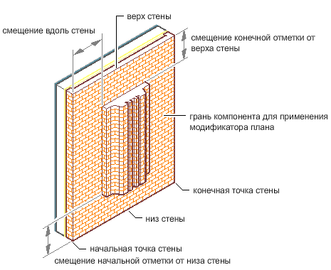 | обозначение конечной высоты модификатора поверхности, | введите значение "Смещение конечной отметки" и укажите, относительно чего выполняется смещение — по верху стены, по базовой высоте стены, по линии привязки стены или по подошве стены. |