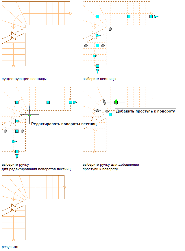 Забежные ступени зоны поворота устанавливаются под углом, вершина которого совпадает с ручкой "Повернуть в центре".