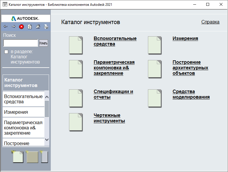 Для открытия категории или подкатегории щелкните на ней. Например, если выбраны "Инструменты формообразующего элемента", будет выведено следующее окно: