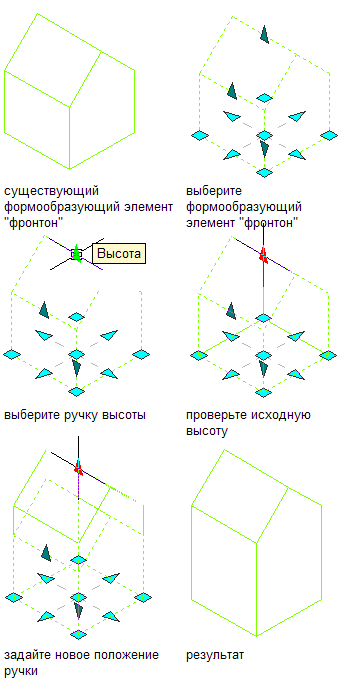 Эта процедура используется для изменения посредством ручек высоты крыши формообразующего элемента "Фронтон".