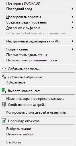 При щелчке правой кнопкой мыши в области чертежа содержание контекстного меню зависит от выбираемого в настоящее время объектов. Например, если выбраны один или несколько объектов дверей, отображается контекстное меню для дверей, как показано ниже.