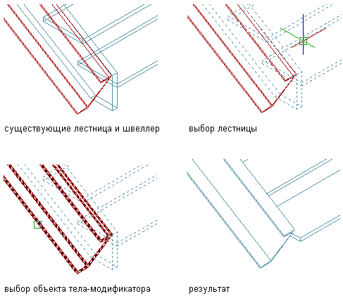 На следующем рисунке показано, как использовать канал в качестве тела-модификатора для замены компонента несущей конструкции лестницы.