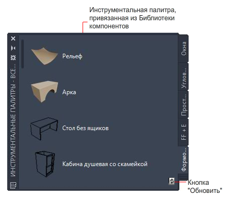 Если инструментальная палитра связана с набором инструментальных палитр из Библиотеки компонентов, внизу палитры отображается кнопка "Обновить".