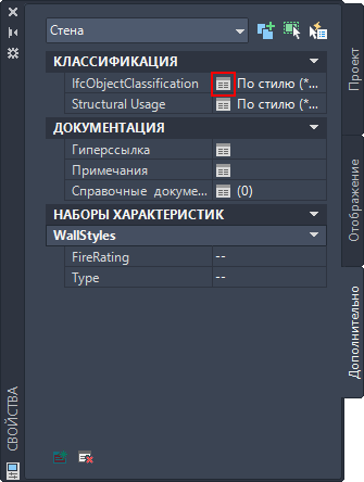 - На палитре свойств передйите к разделу "Классификация" на вкладке "Расширенные данные", щелкните "IFCObjectClassification" и выберите классификацию.