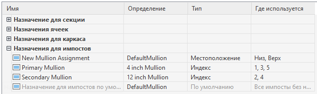 Новое назначение для импоста отображается в списке назначений для импостов.