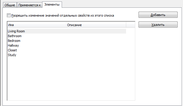 Описания списков представляют собой именованные списки пространств и зон. Можно присоединить описание списка к стилю пространств или стилю зоны, чтобы обеспечить использование всеми пространствами или зонами, вставляемыми с данными стилем, имен из этого списка. Описания списков могут создаваться для различных целей, например для гарантии непротиворечивого именования пространств в соответствии со стандартом для здания.