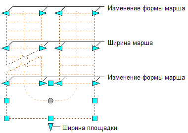 Ручки "Изменение формы марша", "Ширина марша" и "Ширина площадки" П-образной лестницы