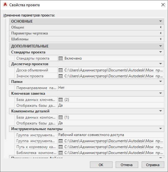 Имеется возможность определения или изменения дополнительных свойств проекта, таких как стандарты, изображения, ключевые заметки, компоненты деталей и инструментальные палитры.