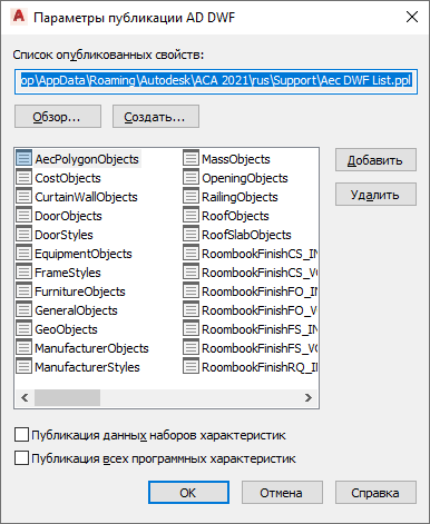 В результате будут публиковаться все автоматически задаваемые свойства, связанные с объектами, выбранными для экспорта в DWF- или DWFx-файл.