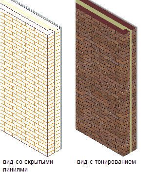 Если в стене имеются специальные изоляционные компоненты, то для них можно назначить светлый, полупрозрачный материал. Для сечения стены можно назначить специальный образец штриховки разреза или заливку, которая отличается от обычной кирпичной штриховки поверхности.