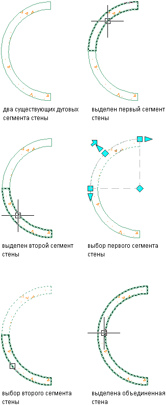 На иллюстрации ниже показано соединение двух изогнутых сегментов стены после выделения каждого сегмента по отдельности.