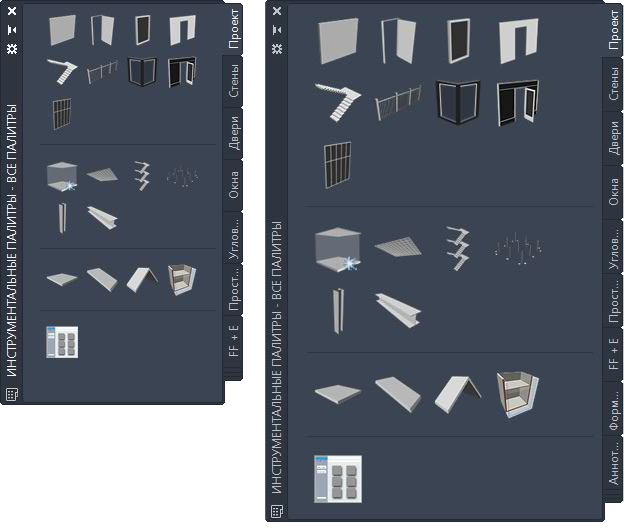 Палитры инструментов с разными по размеру значками