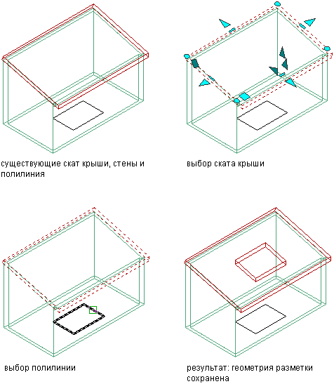 6. Прим.: При создании отверстия, которое находится на наружной стороне или накладывается на базовую линию или линию периметра перекрытия или ската крыши в месте свеса, в теле перекрытия или ската крыши выполняется вырез, но бордюрная рейка и карниз сохраняются неизменными. В этом случае рекомендуется создавать отверстие, вырезая его из перекрытия или ската крыши.