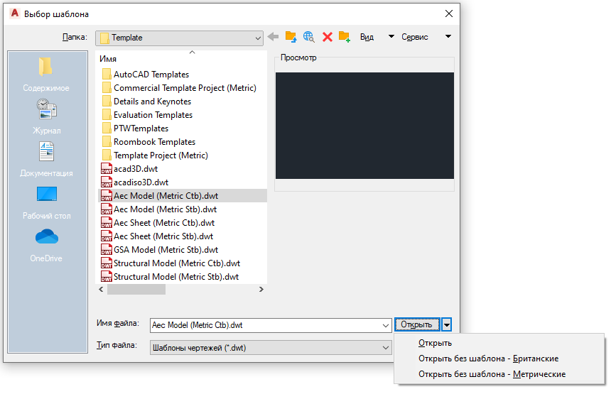 Чертежи, созданные без использования шаблонов, не содержат пользовательских или заранее заданных настроек, например, конфигураций экранного представления или архитектурных единиц. В чертежах без шаблонов используются параметры, указанные в диалоговом окне "Настройка чертежа".