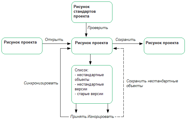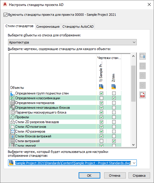 Если проект или чертеж проекта синхронизируется со стандартами, стили и графические параметры сравниваются со стандартами проекта и, в случае несоответствия версий, стили и графические параметры обновляются.