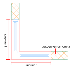 Прим.: Значения ширины 1 и 2 для углового окна определяются посредством измерения ширины проема, которое можно изменить на палитре свойств.