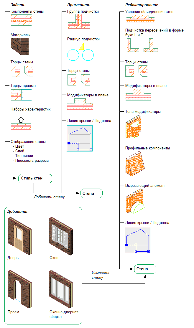Многие параметры стены определяются используемыми стилями стен. Можно создавать простые стили стен, которые на экране отображаются скорее символически, либо детально разработанные стили стен, отображаемые на экране репрезентативно, с множеством элементов, присущих реальной стене. В стиле стены определяются следующие параметры настройки: