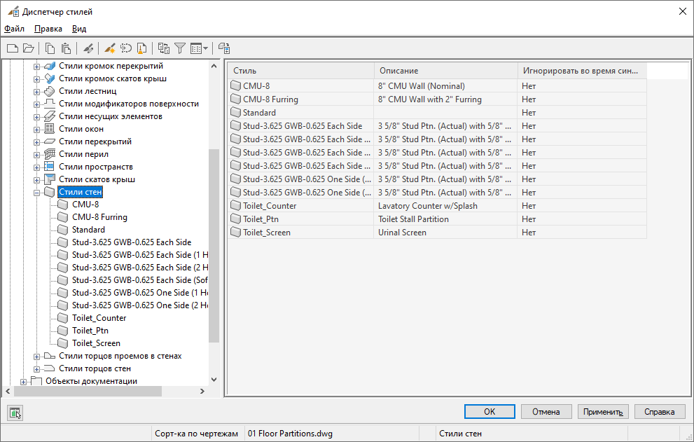 Стили сгруппированы по трем категориям: "Архитектура", например "Стили дверей"; "Объекты документации", например "Стили спецификаций"; и "Универсальные объекты", например "Стили ключей слоев". Внутри каждой категории стили перечисляются в алфавитном порядке. Для фильтрования древа с целью отображения стилей только одного типа выберите тип стилей и на панели инструментов Диспетчера стилей нажмите