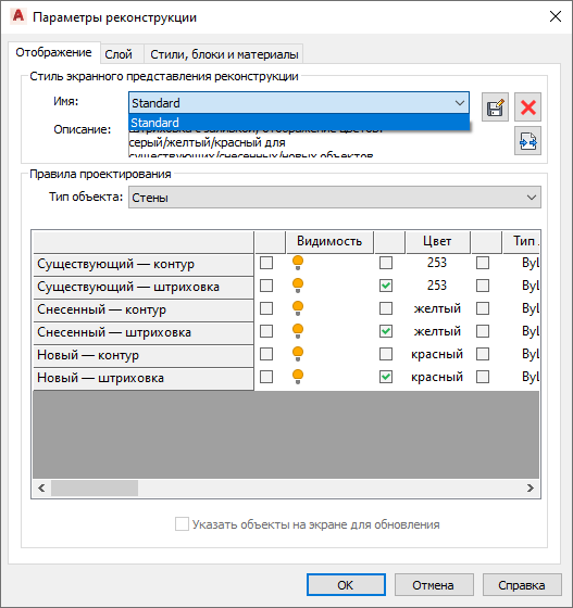 Можно изменить режим отображения свойств объектов на чертеже в определенных категориях, разблокировав их, внеся в них по отдельности изменения по типам объектов и сохранив их в стиле отображения для реконструкции. Внесенные изменения сохраняются в файле текущего чертежа.