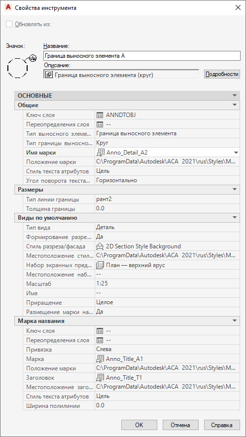 | Имя | Общий | Установка стандартного имени для видов пространства модели, создаваемых с помощью данного инструмента. Имя, заданное с помощью данного инструмента, можно переопределить во время вставки выносного элемента в чертеж. |