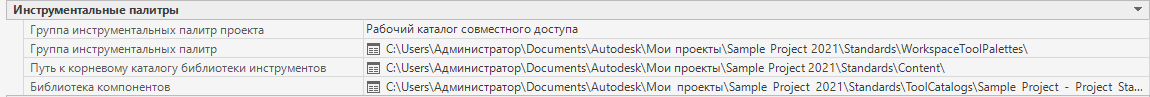 Если выбран "Рабочий каталог совместного доступа", путь, выбранный для параметра "Группа инструментальных палитр", добавляется в пользовательский профиль проекта (AWS), и каталог инструментов открывается в указанной папке. Если выбран "Индивидуальный рабочий каталог", папка создается внутри папки C:\My Documents\Autodesk\My Projects\<project name>, и инструментальные палитры копируются в эту папку. Если выбрать значение "Нет" группа инструментальных палитр для данного проекта не используется, и другие свойства в категории "Инструментальные палитры" не отображаются.