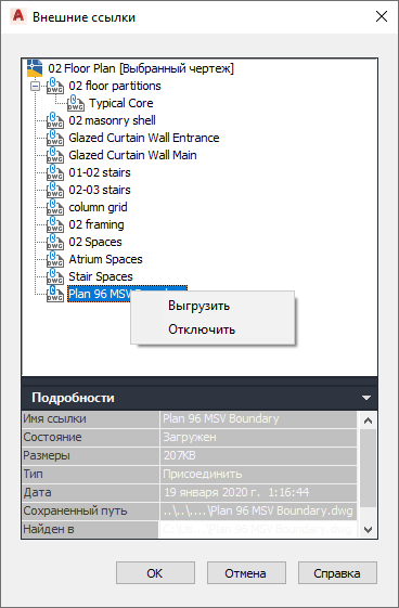 Из контекстного меню можно выгрузить, повторно загрузить или удалить присоединенную внешнюю ссылку.
