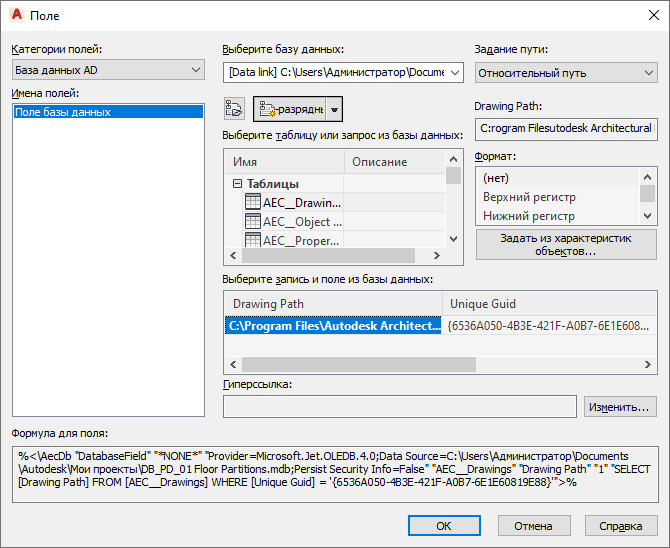 | вставить поле базы данных в описание атрибута, | см. раздел "Вставка полей в атрибуты AutoCAD". |