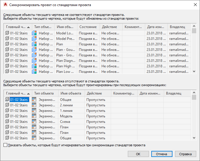 В этом случае во время последующих синхронизаций несовместимый объект не будет отображаться в списке, если только не установлен флажок "Показать объекты, которые будут игнорироваться при синхронизации стандартов проекта" или если в Диспетчере стилей или Диспетчере экранных представлений снят флажок "Игнорировать" для параметра стиля или отображения, как описано в разделе "Исключение стилей и параметров отображения из синхронизации".