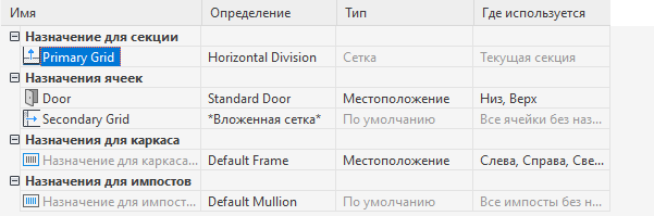 определения вложенных сетки можно составить, пользуясь вкладкой "Правила проектирования" диалогового окна "Свойства стилей витража". Список сеток дан в левой секции окна в виде дерева. Одна первичная сетка существует всегда. В первичной сетке может быть одна или несколько вторичных сеток. Вторичная сетка может содержать одну или несколько третичных сеток, и т.д.