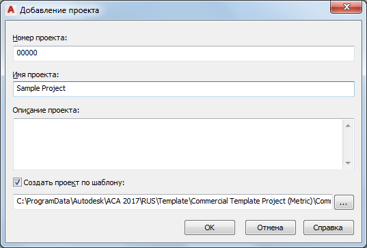 Прим.: При создании нового проекта невозможно непосредственно задать все вспомогательные файлы и пути; можно только определить имя, номер, описание и шаблон проекта. Остальные параметры можно определить только после того, как проект создан. Если проект создается на основе шаблона, в качестве исходных значений параметров используются свойства шаблона.
