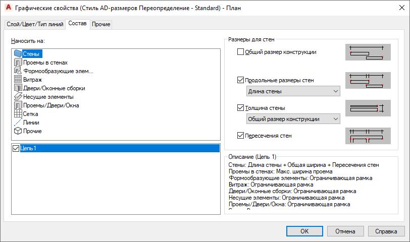 Под списком "Применить к" показан список размерных цепей, имеющихся в этом стиле AD-размеров.