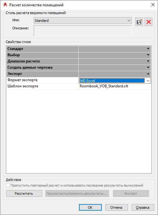 В Roombook имеются стандартные формы экспорта MS Excel для каждого стандарта расчета, в котором перечислены все вычисляемые количественные характеристики помещения, структурированные на одном листе.
