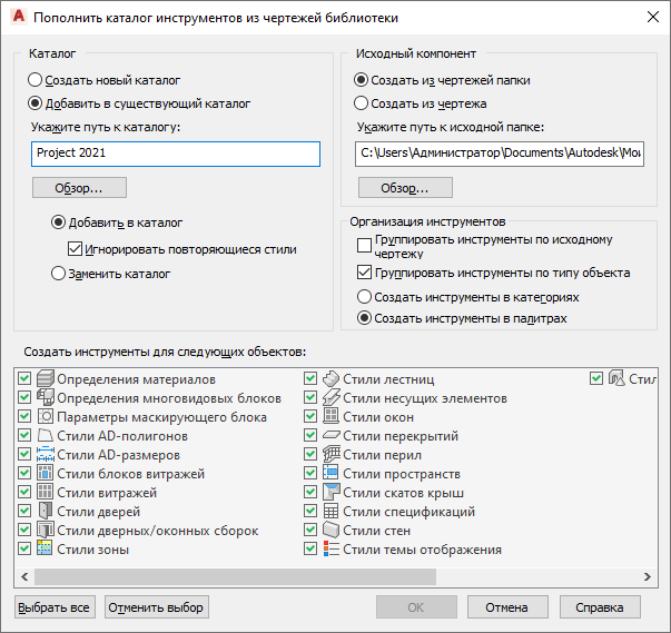 | сгруппировать полученные инструменты по типу объектов | выберите "Группировать инструменты по типу объекта". Данная функция особенно удобна, если надо объединить стили из различных чертежей в новый каталог стилей. Созданные инструменты размещаются в категориях или палитрах с именами "Стены", "Двери" и т. д. Прим.: Если помечены оба флажка, то группировка инструментов в каталоге производится сначала по чертежам, а затем по типам объектов, при этом категории создаются из чертежей, а палитры - из типов объектов. Такой вариант используется, поскольку палитры не могут быть вложенными. В данном случае переключатели для категорий и палитр отключены, включен переключатель "Создать инструменты по палитрам".