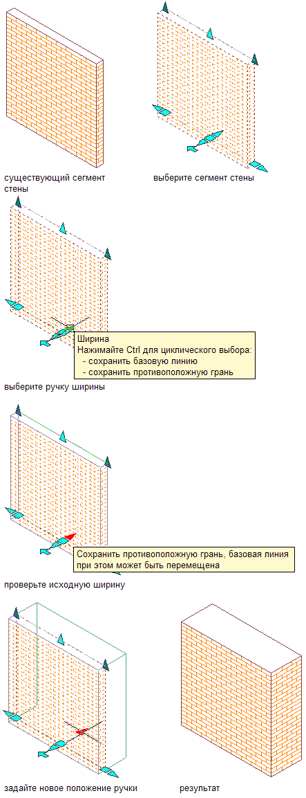 Для изменения толщины стены с сохранением противоположной грани стены с помощью ручек