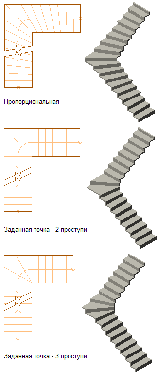 Три различных типа забежной лестницы определяют различные уровни средств управления лестницами с половинным поворотом и с поворотом в одну четверть: "пропорциональная", "одиночная точка" и "вручную".