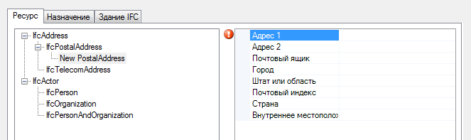 На вкладке "Ресурс" в диалоговом окне "Ресурс и назначение IFC" разверните категорию "Ресурс IFC" (например, IfcAddress).