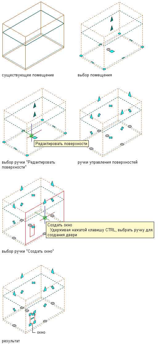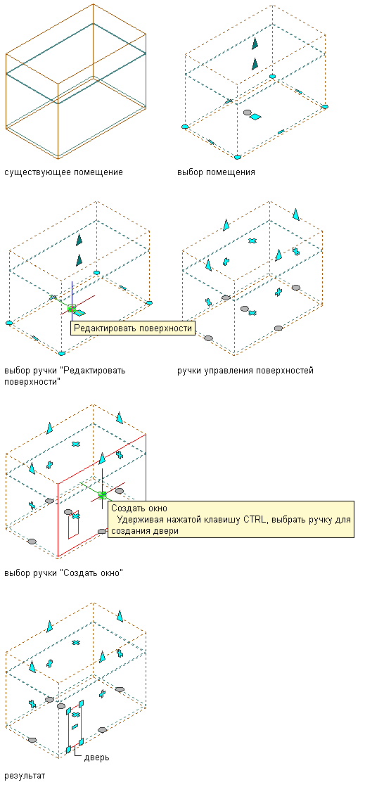 Для добавления проемов к поверхности пространства можно использовать ручки или Диспетчер пространства/зоны.